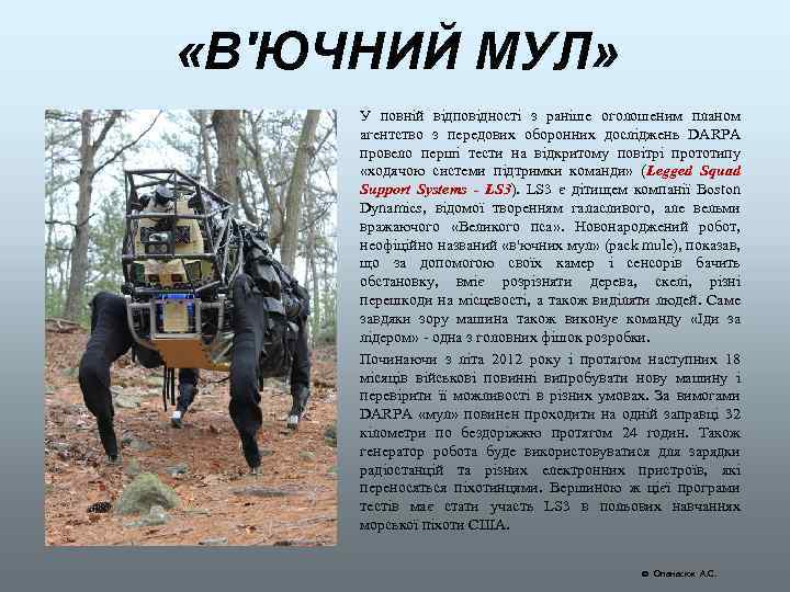 «В'ЮЧНИЙ МУЛ» У повній відповідності з раніше оголошеним планом агентство з передових оборонних досліджень DARPA провело перші тести на відкритому повітрі прототипу «ходячою системи підтримки команди» (Legged Squad Support Systems - LS 3). LS 3 є дітищем компанії Boston Dynamics, відомої творенням галасливого, але вельми вражаючого «Великого пса» . Новонароджений робот, неофіційно названий «в'ючних мул» (pack mule), показав, що за допомогою своїх камер і сенсорів бачить обстановку, вміє розрізняти дерева, скелі, різні перешкоди на місцевості, а також виділяти людей. Саме завдяки зору машина також виконує команду «Іди за лідером» - одна з головних фішок розробки. Починаючи з літа 2012 року і протягом наступних 18 місяців військові повинні випробувати нову машину і перевірити її можливості в різних умовах. За вимогами DARPA «мул» повинен проходити на одній заправці 32 кілометри по бездоріжжю протягом 24 годин. Також генератор робота буде використовуватися для зарядки радіостанцій та різних електронних пристроїв, які переносяться піхотинцями. Вершиною ж цієї програми тестів має стати участь LS 3 в польових навчаннях морської піхоти США. Опанасюк А. С.