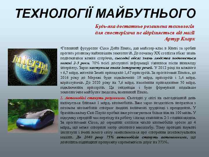 ТЕХНОЛОГІЇ МАЙБУТНЬОГО Будь-яка достатньо розвинена технологія для спостерігача не відрізняється від магії Артур Кларк • Головний футуролог Cisco Дейв Еванс, дав майстер-клас в Києві та зробив прогноз розвитку найновіших технологій. До початку XX століття обсяг знань подвоювався кожне сторіччя, сьогодні обсяг знань людства подвоюється кожні 2 -3 роки. 70% всієї доступної інформації з'явилося після винаходу інтернету. Зараз наступила епоха інтернету речей. У 2012 році на кожного з 6, 7 млрд. жителів Землі припадало 1, 47 пристроїв. За прогнозами Еванса, до 2016 року до Мережі буде підключено 19 млрд. пристроїв і 3, 4 млрд. користувачів. До 2020 року на 7, 6 млрд. населення припадатиме 50 млрд. підключених пристроїв. Ця тенденція і буде формувати подальше технологічне майбутнє людства, впевнений Еванс. 1. Автомобілі стануть розумними. Сьогодні у світі на сьогоднішній день налічується близько 1 млрд. автомобілів. Вже зараз нездатність впоратися з потоком автомобілів створює людині величезні труднощі і прецеденти. У бразильському Сан-Пауло пробки вже розтягуються більш ніж на 100 миль. У підсумку середній час переїзду на роботу і назад становить 2 -3 години щодня. За прогнозами Cisco, до середини століття число автомобілів зросте до 4 млрд. , що може створити затор світового масштабу. Тому провідні наукові інститути і вчені всього світу замислюються про створення інтелектуальних машин. До 2040 року 75% автомобілів стануть автономними, що дозволить підвищити пропускну спроможність доріг на 273%.