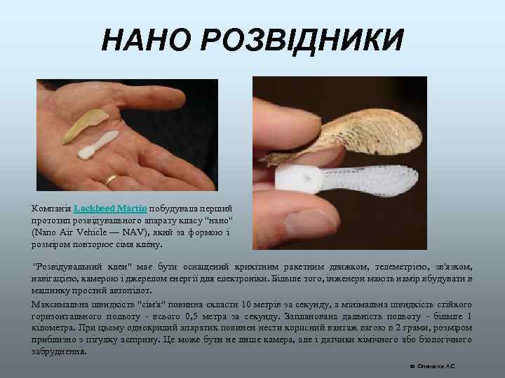 НАНО РОЗВІДНИКИ Компанія Lockheed Martin побудувала перший прототип розвідувального апарату класу "нано" (Nano Air Vehicle — NAV), який за формою і розміром повторює сімя клёну. "Розвідувальний клен" має бути оснащений крихітним ракетним движком, телеметрією, зв'язком, навігацією, камерою і джерелом енергії для електроніки. Більше того, інженери мають намір вбудувати в машинку простий автопілот. Максимальна швидкість "сім'я" повинна скласти 10 метрів за секунду, а мінімальна швидкість стійкого горизонтального польоту - всього 0, 5 метра за секунду. Запланована дальність польоту - більше 1 кілометра. При цьому однокрилий апаратик повинен нести корисний вантаж вагою в 2 грами, розміром приблизно з пігулку аспірину. Це може бути не лише камера, але і датчики хімічного або біологічного забруднення. Опанасюк А. С.