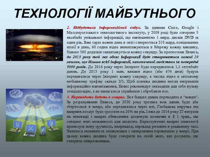 ТЕХНОЛОГІЇ МАЙБУТНЬОГО 2. Відбудеться інформаційний вибух. За даними Cisco, Google і Массачусетського технологічного інституту, у 2008 році було створено 5 ексабайт унікальної інформації, що еквівалентно 1 млрд. дисків DVD за один рік. Вже зараз кожен день в світі створюється 210 млрд. повідомлень email в день, 60 годин відео вивантажуються в Мережу кожну хвилину, більше 560 додатків завантажується кожну секунду. За прогнозами Еванса, до 2013 року той же обсяг інформації буде створюватися кожні 10 хвилин, що більше всієї інформації, накопиченої людством за попередні 5000 років. До 2016 року через Інтернет буде передаватися 1, 3 зеттабайт даних. До 2015 року 1 млн. хвилин відео (або 674 днів) будуть передаватися через Інтернет кожну секунду, а частка відео в світовому мобільному трафіку складе 2/3. Щоб психіка людини могла витримати інформаційне навантаження, Еванс рекомендує знаходити для себе вузьку спеціалізацію, а не намагатися сприймати і обробляти все. 3. Переводити будуть в хмарах. Все більше даних переходить в "хмари". За розрахунками Еванса, до 2020 року третина всіх даних буде або зберігатися в хмарі, або передаватися через неї. Глобальна виручка від хмарних послуг буде зростати на 20% на рік. І вже до 2014 року IT-витрати на інновації і хмарні обчислення досягнуть позначки в $ 1 трлн. , що створює нові можливості для людства. Користувачеві хмарні технології принесуть нову зручність, наприклад, переклад розмови в реальному часі. З'явиться можливість спілкування з синхронним перекладом у хмарі. При цьому кожна людина буде говорити на своїй мові, але розуміти, що говорить співрозмовник.