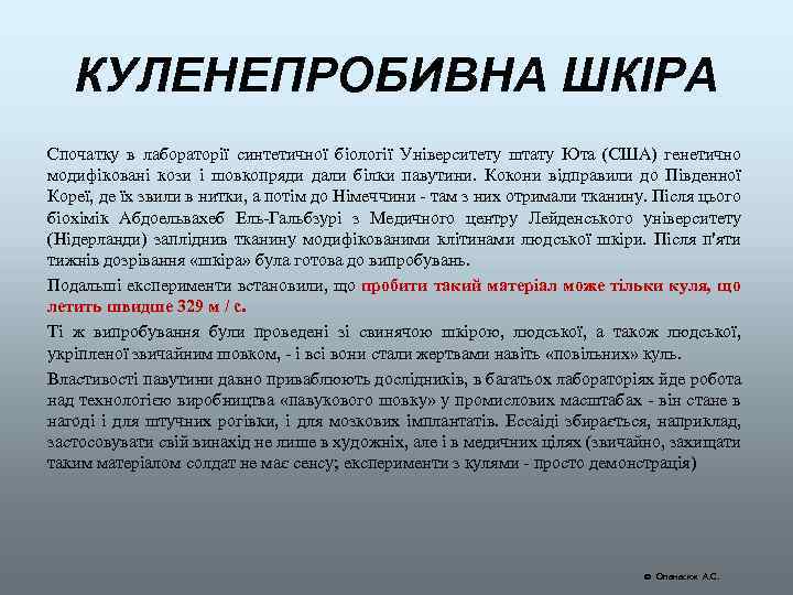 КУЛЕНЕПРОБИВНА ШКІРА В результаті досліджень голландських біологів, кевлар може втратити звання найміцнішої тканини на планеті і поступитися місцем органічному поєднанню павутини і людської шкіри. У створеного нового куленепробивного матеріалу, який поки не має назви, величезний потенціал. Куленепробивний кевлар має 33 шари, шарів павутини потрібно значно менше оскільки вона сама по собі у 3 рази міцніша кевлара і в 15 разів міцніше сталі. Раніше будь-які додаткові матеріали з павутинням з'єднувалися погано. І тільки шкіра виявилася універсальним закріплювачем для павучого «клею» . У майбутньому вчені планують імплантувати павутиння прямо у тіло людини. Поки що шкіра, вирощена вченими, ще не настільки міцна, щоб зупиняти кулю на повній швидкості: вдалося виростити тільки 4 -шаровий матеріал. Але разом нейрохірурги та біологами продовжують роботу над удосконаленням винаходу. Вони впевнені, що в майбутньому павуковий шовк можна буде використовувати в медицині, і з його допомогою регенерувати втрачені кінцівки. http: //www. diary. ru/~prividenie-nava/p 165936753. htm http: //www. rg. ru/2011/08/26/bron-poln. html Опанасюк А. С.