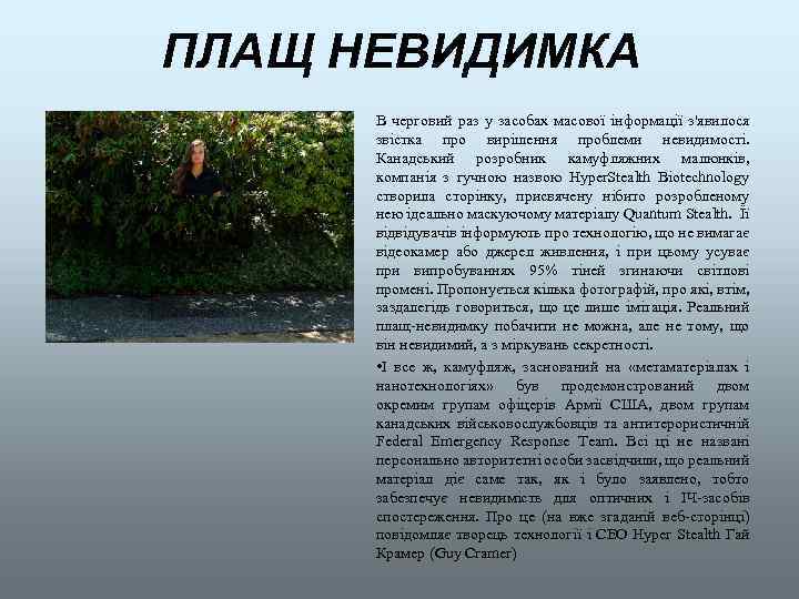 ПЛАЩ НЕВИДИМКА В черговий раз у засобах масової інформації з'явилося звістка про вирішення проблеми невидимості. Канадський розробник камуфляжних малюнків, компанія з гучною назвою Hyper. Stealth Biotechnology створила сторінку, присвячену нібито розробленому нею ідеально маскуючому матеріалу Quantum Stealth. Її відвідувачів інформують про технологію, що не вимагає відеокамер або джерел живлення, і при цьому усуває при випробуваннях 95% тіней згинаючи світлові промені. Пропонується кілька фотографій, про які, втім, заздалегідь говориться, що це лише імітація. Реальний плащ-невидимку побачити не можна, але не тому, що він невидимий, а з міркувань секретності. • І все ж, камуфляж, заснований на «метаматеріалах і нанотехнологіях» був продемонстрований двом окремим групам офіцерів Армії США, двом групам канадських військовослужбовців та антитерористичній Federal Emergency Response Team. Всі ці не названі персонально авторитетні особи засвідчили, що реальний матеріал діє саме так, як і було заявлено, тобто забезпечує невидимість для оптичних і ІЧ-засобів спостереження. Про це (на вже згаданій веб-сторінці) повідомляє творець технології і CEO Hyper Stealth Гай Крамер (Guy Cramer)