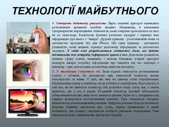 ТЕХНОЛОГІЇ МАЙБУТНЬОГО 4. Створять додаткову реальність. Зараз технічні пристрої навчилися розпізнавати предмети подібно людині. Наприклад, в японських супермаркетах впроваджена технологія, коли покупки проводяться на касі не по скан-коду. Комп'ютер фізично розпізнає продукт і отримує всю інформацію про нього з "хмари". Другий приклад - розпізнавання мови за допомогою програми Siri для i. Phone. Ще один приклад - доповнена реальність, коли людина отримує додаткову інформацію за допомогою окулярів. У світі вже розробляються контактні лінзи, які будуть доставляти всю потрібну інформацію прямо в око. Додаткова реальність змінить сферу освіти, медицину і зв'язок. Оскільки згадані пристрої нададуть лікарю потрібну інформацію про пацієнта під час операції, а механіку - дані діагностики автомобіля, який він лагодить. 5. У телевізора з'являться очі. Всім відома технологія розпізнавання голосу і об'єктів. За допомогою цих технологій телевізор зможе спостерігати за нами. Є ідеї, які вже на даному етапі передбачають вбудовування камер в телевізор, як це роблять в смартфонах. В результаті, в той час, як ви дивитеся телевізор, він розпізнає вашу стать, вік, а також дивиться, що у вас в руках. Розумний телевізор здатний заблокувати заборонений контент, якщо його дивиться дитина. Крім того, спеціально під глядача формується тагетірованний контент. Така технологія створить новий виток розповсюдження реклами. Цифрова реклама буде розпізнавати людські обличчя, визначати вік, стать, термін проживання в даній місцевості, тип реакції і передавати особисті унікальні оголошення. Така технологія може з'явитися вже протягом 10 років.