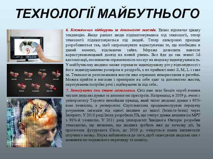 ТЕХНОЛОГІЇ МАЙБУТНЬОГО 6. Костюмчик підберуть за допомогою жестів. Еванс відзначає цікаву тенденцію. Якщо раніше люди підлаштовувались під технології, тепер технології підлаштовуються під людей. Тепер електронні прилади розробляються так, щоб запропонувати користувачам те, що необхідно в даний момент, відсікаючи зайве. Мережа дозволить вивести користувальницький досвід на новий рівень. Все йде до так званої 3 dкастомізації, посилюючи спрямованість послуг на людську індивідуальність. У майбутньому людина зможе отримати індивідуальну річ у відповідності з його індивідуальним розміром в роздробі, а не прийняті нині S, M, L і таке ін. Технологія розпізнавання жестів вже отримала використання в ритейлі. Можна прийти в магазин і приміряти на себе одяг за допомогою жестів, пересуваючи потрібні речі і підбираючи їх під себе. 7. Записувати сни стане можливим. Світ вже знає безліч спроб вчених читати людські думки за допомогою пристроїв. Наприклад, в 2009 р. вчені з університету Торонто винайшли прилад, який читає людські думки з 80%вою точністю, а університет Саутгемптона продемонстрував передачу розумових сигналів від однієї людини до іншої (brain-to-brain) через Інтернет. У 2010 році Інтел розробила ПЗ, що зчитує думки людини по МРТ з 90%-й точністю. У 2011 році університет Західного Онтаріо розробив технологію, що визначає, що людина зробить вже до початку дії. За прогнозом футуролога Cisco, до 2030 р. очікується поява імплантатів штучного мозку. Наука наблизиться до того, щоб записувати людські сни з можливістю подальшого перегляду та аналізу.