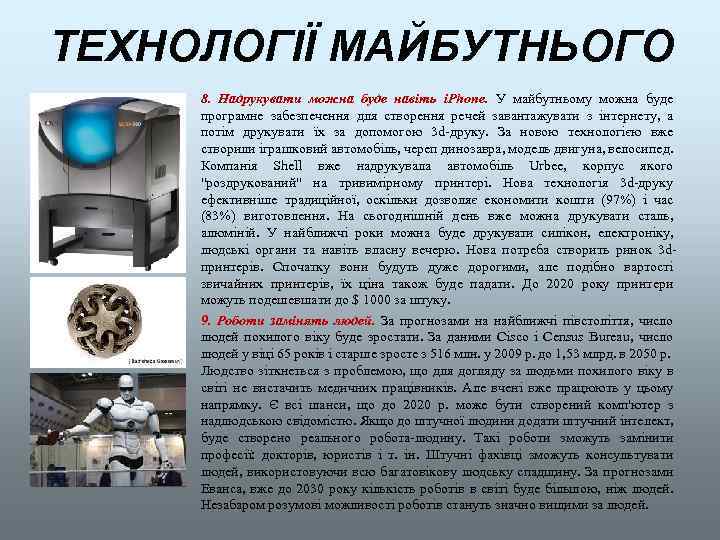 ТЕХНОЛОГІЇ МАЙБУТНЬОГО 8. Надрукувати можна буде навіть i. Phone. У майбутньому можна буде програмне забезпечення для створення речей завантажувати з інтернету, а потім друкувати їх за допомогою 3 d-друку. За новою технологією вже створили іграшковий автомобіль, череп динозавра, модель двигуна, велосипед. Компанія Shell вже надрукувала автомобіль Urbee, корпус якого "роздрукований" на тривимірному принтері. Нова технологія 3 d-друку ефективніше традиційної, оскільки дозволяє економити кошти (97%) і час (83%) виготовлення. На сьогоднішній день вже можна друкувати сталь, алюміній. У найближчі роки можна буде друкувати силікон, електроніку, людські органи та навіть власну вечерю. Нова потреба створить ринок 3 dпринтерів. Спочатку вони будуть дуже дорогими, але подібно вартості звичайних принтерів, їх ціна також буде падати. До 2020 року принтери можуть подешевшати до $ 1000 за штуку. 9. Роботи замінять людей. За прогнозами на найближчі півстоліття, число людей похилого віку буде зростати. За даними Cisco і Census Bureau, число людей у віці 65 років і старше зросте з 516 млн. у 2009 р. до 1, 53 млрд. в 2050 р. Людство зіткнеться з проблемою, що для догляду за людьми похилого віку в світі не вистачить медичних працівників. Але вчені вже працюють у цьому напрямку. Є всі шанси, що до 2020 р. може бути створений комп'ютер з надлюдською свідомістю. Якщо до штучної людини додати штучний інтелект, буде створено реального робота-людину. Такі роботи зможуть замінити професії: докторів, юристів і т. ін. Штучні фахівці зможуть консультувати людей, використовуючи всю багатовікову людську спадщину. За прогнозами Еванса, вже до 2030 року кількість роботів в світі буде більшою, ніж людей. Незабаром розумові можливості роботів стануть значно вищими за людей.