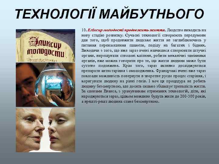 ТЕХНОЛОГІЇ МАЙБУТНЬОГО 10. Еліксир молодості продовжить життя. Людство виходить на нову стадію розвитку. Сучасні технології створюють передумови для того, щоб продовжити людське життя не заглиблюючись у питання перенаселення планети, поділу на багатих і бідних. Виходячи з того, що вже зараз вчені навчилися створювати штучні органи, вирощувати стволові клітини, робити механічні замінники органів, вже можна говорити про те, що життя людини може бути суттєво подовжене. Крім того, зараз активно досліджуються препарати антистаріння і омолодження. Французькі вчені вже зараз показали можливість повернути в зворотне русло процес старіння, і коригувати людину на рівні генів. І хоч ця процедура не робить людину безсмертною, але досить сильно збільшує тривалість життя. За словами Еванса, з урахуванням отриманих технологій, діти, які народжуються зараз, цілком можливо будуть жити до 200 -300 років, а врешті-решт людина стане безсмертною.