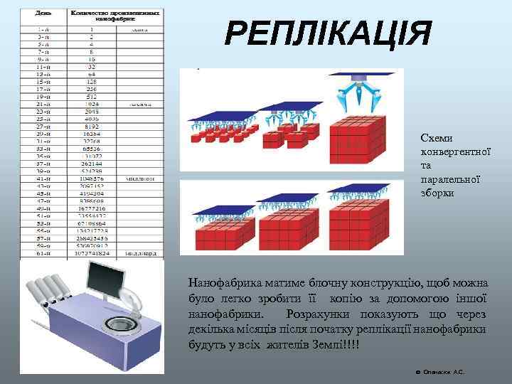 РЕПЛІКАЦІЯ Схеми конвергентної та паралельної зборки Нанофабрика матиме блочну конструкцію, щоб можна було легко зробити її копію за допомогою іншої нанофабрики. Розрахунки показують що через декілька місяців після початку реплікації нанофабрики будуть у всіх жителів Землі!!!! Опанасюк А. С.
