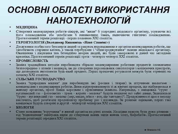ОСНОВНІ ОБЛАСТІ ВИКОРИСТАННЯ НАНОТЕХНОЛОГІЙ • • • МЕДИЦИНА Створення молекулярних роботів-лікарів, які "жили" б усередині людського організму, усуваючи всі його пошкодження або запобігали б виникненню таких, включаючи генетичні пошкодження. Прогнозований термін реалізації - перша половина XXI століття. ГЕРОНТОЛОГІЯ (Володимир Кишинець «Нано Сапиенс» ) Досягнення особистого безсмертя людей за рахунок впровадження в організм молекулярних роботів, що запобігають старінню клітин, а також перебудови і "облагороджування" тканин людського організму. Оживлення і лікування тих безнадійно хворих людей, які були заморожені в даний час методами крионіки. Прогнозований термін реалізації: третя - четверта четверті XXI століття. ПРОМИСЛОВІСТЬ Заміна традиційних методів виробництва збіркою молекулярними роботами предметів споживання безпосередньо з атомів і молекул, аж до створення персональних синтезаторів і копіюючих пристроїв, що дозволяють виготовити будь-який предмет. Перші практичні результати можуть бути отримані на початку XXI століття. СІЛЬСЬКЕ ГОСПОДАРСТВО Заміна "природних машин" для виробництва їжі (рослин і тварин) їх штучними аналогами - комплексами з молекулярних роботів. Вони відтворюватимуть ті ж хімічні процеси, що відбуваються в живому організмі, проте більш коротким і ефективним шляхом. Наприклад, з ланцюжка "грунт - вуглекислий газ - фотосинтез - трава - корова - молоко" будуть видалені всі зайві ланки. Залишиться "грунт - вуглекислий газ - молоко (сир, масло, м'ясо - все, що завгодно)". Продуктивності цього методу вистачить, щоб розв'язати продовольчу проблему раз і назавжди. За різними оцінками, перші такі комплекси будуть створені в другій - четвертій четвертях XXI століття. БІОЛОГІЯ Стане можливим "втручання" в живий організм на рівні атомів. Наслідки можуть бути дуже різними - від "відновлення" вимерлих видів до створення нових типів живих істот, біороботів. Прогнозований термін реалізації: середина XXI століття. Опанасюк А. С.