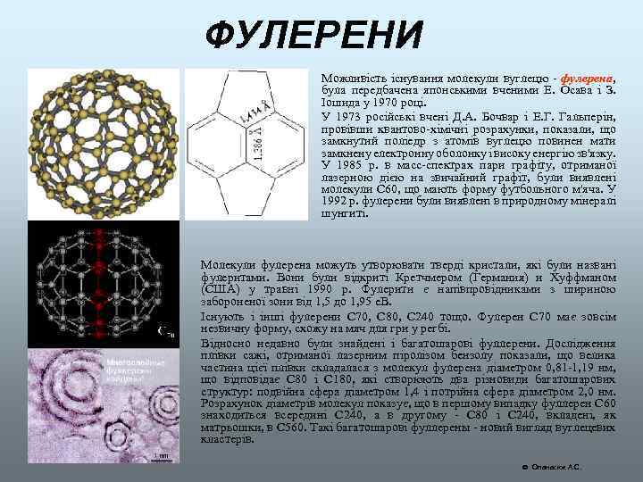 ФУЛЕРЕНИ • • Можливість існування молекули вуглецю - фулерена, була передбачена японськими вченими Е. Осава і З. Іошида у 1970 році. У 1973 російські вчені Д. А. Бочвар і Е. Г. Гальперін, провівши квантово-хімічні розрахунки, показали, що замкнутий поліедр з атомів вуглецю повинен мати замкнену електронну оболонку і високу енергію зв'язку. У 1985 р. в масс-спектрах пари графіту, отриманої лазерною дією на звичайний графіт, були виявлені молекули С 60, що мають форму футбольного м'яча. У 1992 р. фулерени були виявлені в природному мінералі шунгиті. Молекули фулерена можуть утворювати тверді кристали, які були названі фулеритами. Вони були відкриті Кретчмером (Германия) и Хуффманом (США) у травні 1990 р. Фулерити є напівпровідниками з шириною забороненої зони від 1, 5 до 1, 95 е. В. Існують і інші фулерени С 70, С 80, С 240 тощо. Фулерен С 70 має зовсім незвичну форму, схожу на мяч для гри у регбі. Відносно недавно були знайдені і багатошарові фуллерени. Дослідження плівки сажі, отриманої лазерним піролізом бензолу показали, що велика частина цієї плівки складалася з молекул фулерена діаметром 0, 81 -1, 19 нм, що відповідає С 80 і С 180, які створюють два різновиди багатошарових структур: подвійна сфера діаметром 1, 4 і потрійна сфера діаметром 2, 0 нм. Розрахунок діаметрів молекул показує, що в першому випадку фуллерен С 60 знаходиться всередині С 240, а в другому - С 80 і С 240, вкладені, як матрьошки, в С 560. Такі багатошарові фуллерены - новий вигляд вуглецевих кластерів. Опанасюк А. С.