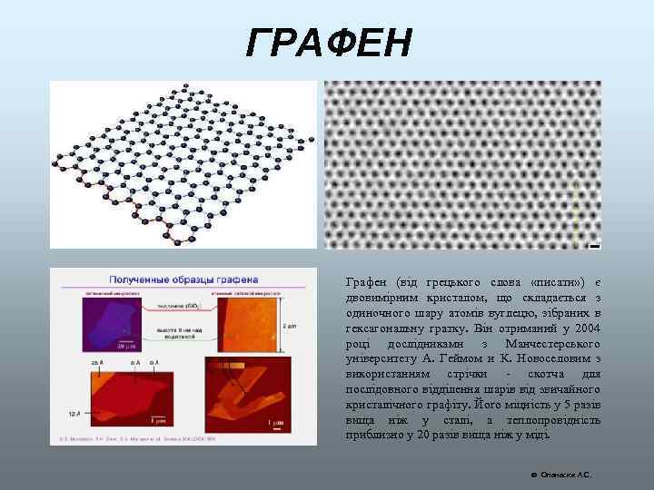 ГРАФЕН Графен (від грецького слова «писати» ) є двовимірним кристалом, що складається з одиночного шару атомів вуглецю, зібраних в гексагональну гратку. Він отриманий у 2004 році дослідниками з Манчестерського університету А. Геймом и К. Новоселовим з використанням стрічки - скотча для послідовного відділення шарів від звичайного кристалічного графіту. Його міцність у 5 разів вища ніж у сталі, а теплопровідність приблизно у 20 разів вища ніж у міді. Опанасюк А. С.