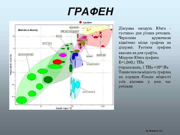 ГРАФЕН Діаграма «модуль Юнга - густина» для різних речовин. Червоним кружечком відмічено місце графена на діаграмі. Густина графена вказана як для графіта. Модулю Юнга графена Е=1, 0± 0, 1 ТПа (терапаскаль, 1 ТПа =1012 Па Таким чином міцність графена на порядок більша міцності усіх відомих у наш час речовин Опанасюк А. С.