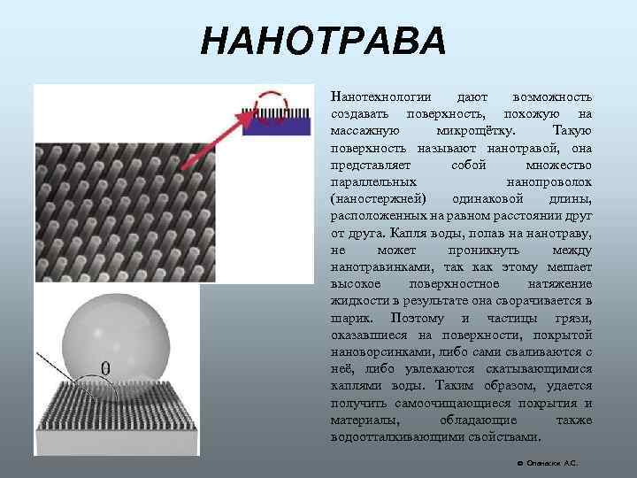 НАНОТРАВА Нанотехнологии дают возможность создавать поверхность, похожую на массажную микрощётку. Такую поверхность называют нанотравой, она представляет собой множество параллельных нанопроволок (наностержней) одинаковой длины, расположенных на равном расстоянии друг от друга. Капля воды, попав на нанотраву, не может проникнуть между нанотравинками, так как этому мешает высокое поверхностное натяжение жидкости в результате она сворачивается в шарик. Поэтому и частицы грязи, оказавшиеся на поверхности, покрытой нановорсинками, либо сами сваливаются с неё, либо увлекаются скатывающимися каплями воды. Таким образом, удается получить самоочищающиеся покрытия и материалы, обладающие также водоотталкивающими свойствами. Опанасюк А. С.