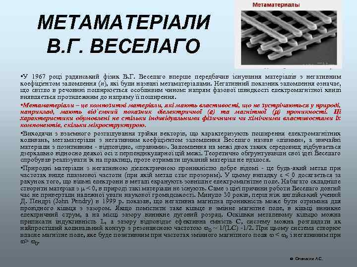 МЕТАМАТЕРІАЛИ Вперше метаматеріал створили американські дослідники під керівництвом Д. Сміта у 2000 р. Він складався з нанорозмірних металевих стрижнів, відповідальних за ε < 0, і мідних кільцевих резонаторів, завдяки яким вдалося отримати μ < 0. Вже в перших експериментах цієї групи були підтверджені основні властивості метаматеріалів, передбачені В. Г. Веселаго в його роботах. Завдяки надзвичайним характеристикам метаматеріалів вони інтенсивно досліджуються у наш час. На їх основі були створені суперлінзи (лінзи для яких не існує дифракційного обмеження), фотоелементи з рекордними параметрами, захисні екрани, які роблять невидимими предмети у мікрохвильовому діапазоні довжин хвиль, абсолютно чорні матеріали, нанопокриття для гасіння електромагнітного випромінювання таких електронних приладів як мобільний телефон та ін. Метаматеріал з від'ємним показником заломлення для ближньої інфрачервоної та мікрохвильової областей спектру Опанасюк А. С.