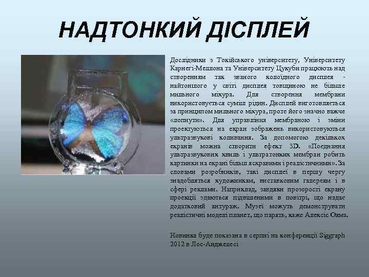НАДТОНКИЙ ДІСПЛЕЙ Дослідники з Токійського університету, Університету Карнегі-Меллона та Університету Цукуби працюють над створенням так званого колоїдного дисплея - найтоншого у світі дисплея товщиною не більше мильного міхура. Для створення мембрани використовується суміш рідин. Дисплей виготовляється за принципом мильного міхура, проте його значно важче «лопнути» . Для управління мембраною і зміни проектуються на екран зображень використовуються ультразвукові коливання. За допомогою декількох екранів можна створити ефект 3 D. «Поєднання ультразвукових хвиль і ультратонких мембран робить картинки на екрані більш яскравими і реалістичними» . За словами розробників, такі дисплеї в першу чергу знадобляться художникам, виставковим галереям і в сфері реклами. Наприклад, завдяки прозорості екрану проекції здаються підвішеними в повітрі, що надає додатковий антураж. Музеї можуть демонструвати реалістичні моделі планет, що парять, каже Алексіс Ояма. Новинка буде показана в серпні на конференції Siggraph 2012 в Лос-Анджелесі