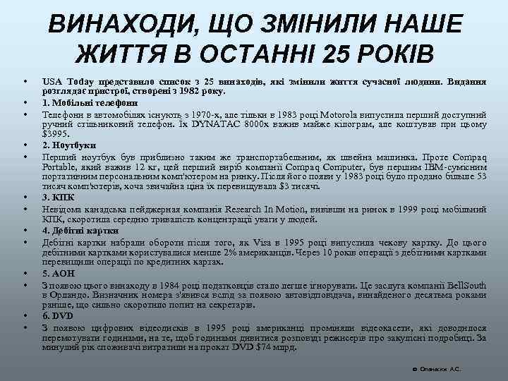 ВИНАХОДИ, ЩО ЗМІНИЛИ НАШЕ ЖИТТЯ В ОСТАННІ 25 РОКІВ • • • • USA Today представило список з 25 винаходів, які змінили життя сучасної людини. Видання розглядає пристрої, створені з 1982 року. 1. Мобільні телефони Телефони в автомобілях існують з 1970 -х, але тільки в 1983 році Motorola випустила перший доступний ручний стільниковий телефон. Їх DYNATAC 8000 x важив майже кілограм, але коштував при цьому $3995. 2. Ноутбуки Перший ноутбук був приблизно таким же транспортабельним, як швейна машинка. Проте Compaq Portable, який важив 12 кг, цей перший виріб компанії Compaq Computer, був першим IBM-сумісним портативним персональним комп'ютером на ринку. Після його появи у 1983 році було продано більше 53 тисяч комп'ютерів, хоча звичайна ціна їх перевищувала $3 тисячі. 3. КПК Невідома канадська пейджерная компанія Research In Motion, вивівши на ринок в 1999 році мобільний КПК, скоротила середню тривалість концентрації уваги у людей. 4. Дебітні картки набрали обороти після того, як Visa в 1995 році випустила чекову картку. До цього дебітними картками користувалися менше 2% американців. Через 10 років операції з дебітними картками перевищили операції по кредитних картах. 5. АОН З появою цього винаходу в 1984 році податковців стало легше ігнорувати. Це заслуга компанії Bell. South в Орландо. Визначник номера з'явився вслід за появою автовідповідача, винайденого десятьма роками раніше, що сильно скоротило попит на секретарів. 6. DVD З появою цифрових відеодисків в 1995 році американці проміняли відеокасети, які доводилося перемотувати годинами, на те, щоб годинами дивитися розповіді режисерів про закулісні подробиці. За минулий рік споживачі витратили на прокат DVD $74 млрд. Опанасюк А. С.