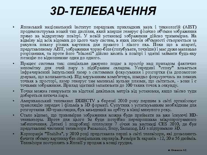 3 D-ЗОБРАЖЕННЯ • Компанія Toshiba Japan перша у світі випустила тривимірний телевізор, який не потребує спеціальних окулярів. • Продажі почалися у грудні 2010 р. в Японії. Будуть випущені дві моделі - 20 -дюймова 20 GL 1 і 12 -дюймова 12 GL 1. Їх робота основана на принципі паралаксного бар'єра, вже відомого за ігровою консоллю Nintendo 3 DS. Для одержання тривимірного ефекту глядачі повинні знаходитися у визначених точках. • 20 -дюймова модель буде працювати на модифікованому процесорі Cell, подібному тому, що використовується у консолі PS 3, в розробці якої Toshiba також приймала участь. 20 -дюймовий дисплей формату 720 p має світлодіоднє підсвічування і крім тривимірних зображень здатен відтворювати і двовимірні. Для максимального ефекту 3 D глядачі повинні знаходитися на відстані як мінімум 90 см від дисплею. • У Японії 20 -дюймова модель буде коштувати 2900 доларів (в перерахунку за курсом), 12 -дюймова - 1450 доларів. Опанасюк А. С.