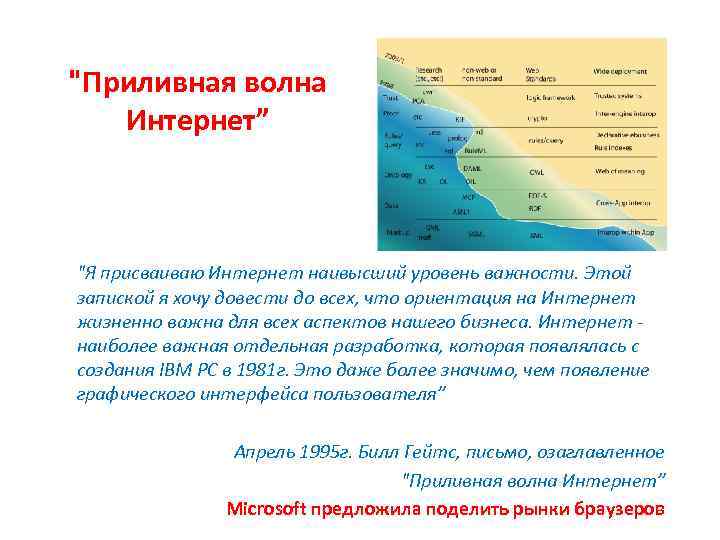 "Приливная волна Интернет” "Я присваиваю Интернет наивысший уровень важности. Этой запиской я хочу довести до всех, что ориентация на Интернет жизненно важна для всех аспектов нашего бизнеса. Интернет наиболее важная отдельная разработка, которая появлялась с создания IBM PC в 1981 г. Это даже более значимо, чем появление графического интерфейса пользователя” Апрель 1995 г. Билл Гейтс, письмо, озаглавленное "Приливная волна Интернет” Microsoft предложила поделить рынки браузеров