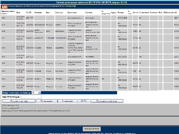 Приложение REGISTR (R-6. 10) Система «REGISTR» обеспечивает выполнение следующих основных функций. • Ввод данных о читателях. • Редактирование и удаление введенной информации. • Проведение многоаспектного поиска в БД читателей и получение количественных распределений по различным характеристикам (в том числе формирование регламентированных статистических отчетов, в частности для Президиума РАН). • В настоящее время в «REGISTR» зарегистрированы читатели из 156 институтов и организаций, включая разовых посетителей. В БД введено 21923 записей. • Система «Регистрация читателей» ( «REGISTR» , R-6. 10) работает как в автономном режиме, так и в составе системы обобщенного статистического мониторинга работы библиотек ЦБС БЕН РАН ( «MONITORING» , S-6. 10) в качестве блока. Поддерживаемая ей БД в настоящее время используется в системе заказа литературы в читальном зале Библиотеки, в блоках системы «MONITORING» , а также в ряде внешних информационных систем.
