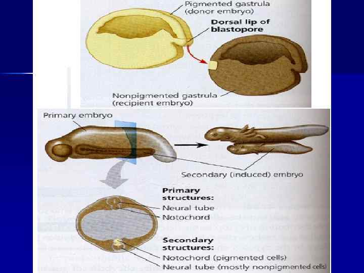 3. Эмбриональная индукция (Г. Шпемен, Х. Мангольд). В процессе развития одна часть зародыша (индуктор или организатор) выступает как причина становления другой (компетентной ткани). Т. о. онтогенез представляет собой цепь последовательных индукций. Судьба клеток зависит от их взаимодействия, что приводит к изменению экспрессии генов. Развитие сопровождается сужением потенций клеток У некоторых видов тотипотентна только зигота, У млекопитающих тотипотентность сохраняется до стадии 16 бластомеров. В ходе эмбриогенеза тотипотентность сменяется плюри- и унипотентностью
