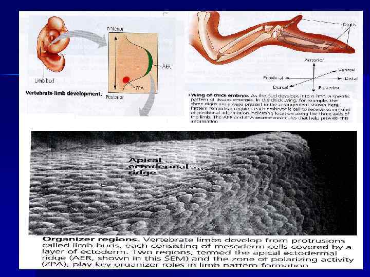 Позиционная информация в развитии конечности позвоночных. Почка конечности имеет организационные области : Апикальный эктодермальный гребень, контролирует формообразование вдоль проксимо-дистальной оси. Поляризующая область контролирует формообразование вдоль передне-задней оси. Организационные области развивающегося зародыша: а. воздействуют при помощи выделяемых ими веществ, диффузия которых в зачатке приводит к образованию градиентов концентрации. б. градиент концентрация мог бы указывать клетке на ее расстояние (позиционное значение) от организационной области. 1. Первоначальная ассиметрия клеток приводит к экспрессии разных генов; 2. Продукты этих генов приводят к дифференцировке специализированных клеточных типов 3. Различные пути формообразования координированы в морфогенезе, что приводит к образованию многочисленных тканей и органов
