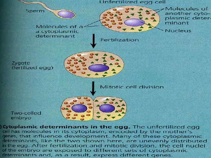 1. Развитие детерминировано генотипом зиготы, а также эпигенетическими различиями возникающими между эмбриональными клетками на ранних этапах развития (преформированный эпигенез). 2. Разные типы дифференцировок обусловлены экспрессией различных генов в разных клетках эмбриона. 3. У большинства видов комбинация цитоплазматических детерминант яйцеклетки и расположение клеток в разных частях эмбриона обеспечивает дифференцировку клеток на ранних этапах эмбрионального развития. 4. Клеточные деления, дифференцировка, взаимодействия 4. клеток ведут к морфогенезу 5. Молекулярные основы детерминации и дифференцировки клеток – это экспрессия генов конечной дифференцировки, кодирующих тканеспецифичные белки.