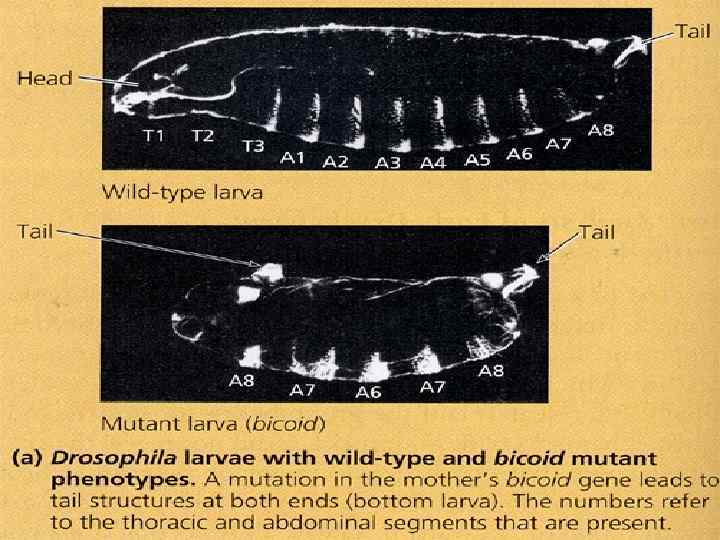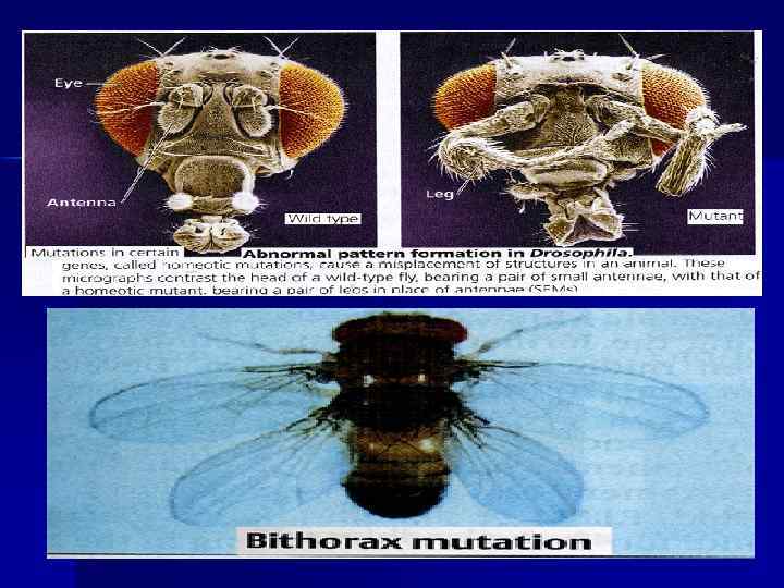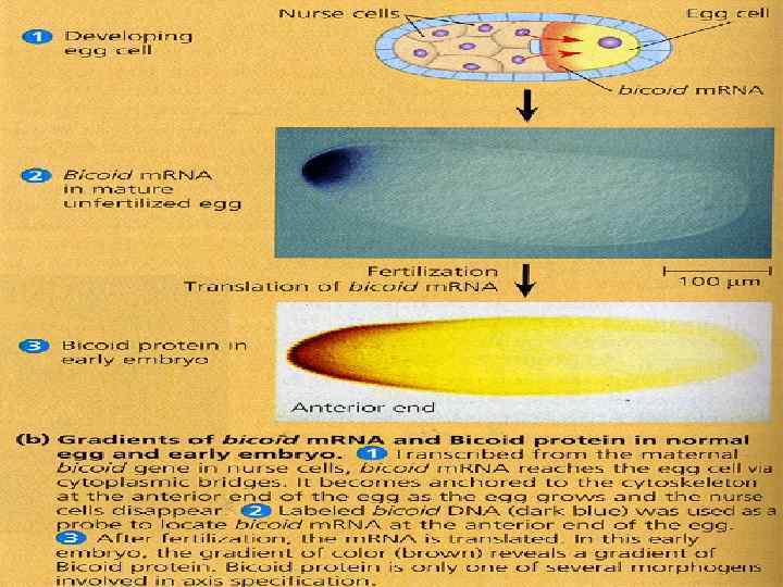 Для исследования развития использовали мутантов дрозофилы, что позволило идентифицировать контролирующие развитие гены. А. Становление осей тела Гены с материнским эффектом (гены полярности яйца ) кодируют детерминанты: • градиент и. РНК гена BICOID определяет передне-заднюю ось зародыша. • градиент BICOID белка (морфоген) активирует гены, кодирующие начало формирования головные и грудные сегменты зародыша. • в формировании вентрально-дорзальной оси участвуют градиенты материнских м. РНК и их белков, локализованные в области заднего полюса яйца.