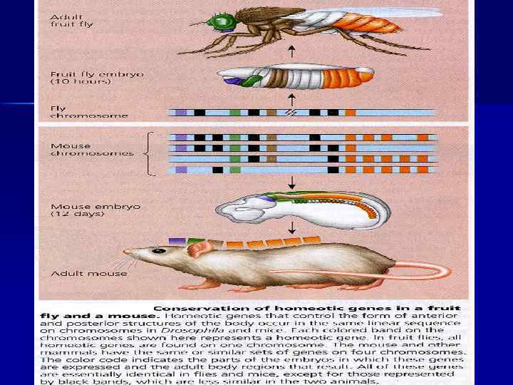 Гомеозисные гены консервативны у разных видов 1. Они содержат гомеобокс, который кодирует гомеодомен (белок регулирующий транскрипцию). 2. Гомеодомены связываться с энхансерными участками ДНК генов конечной дифференцировки. 3. Гомеозисные гены обнаружены у многих организмов. 4. Гомеобокссодержащие гены расположены группами во второй, седьмой, двенадцатой и семнадцатой хромосомах человека. 5. Расположение этих генов соответствует порядку гомологичных генов в хромосоме дрозофилы. 6. Гомеобокссодержащие гены сохранили свою структуру на протяжении длительного периода эволюции, в следствие свойственной им фундаментальной роли в процессах морфогенеза.