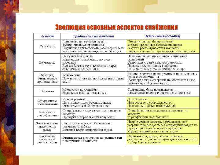 ЗАКУПКИ В СРАВНЕНИИ С СНАБЖЕНИЕМ Факторы Традиционная функция закупок Инновационная функция снабжения Позиция в организации Тактическая функция Стратегическая функция Роль Узкая Широкая Профиль персонала Канцелярский Профессиональный Культура Реактивная Процесс покупки Бюрократический Рационализированный Отношения с поставщиками Натянутые, негибкие Сотрудничество, гибкость Критерии деятельности Цена закупаемой Общие затраты и качество единицы