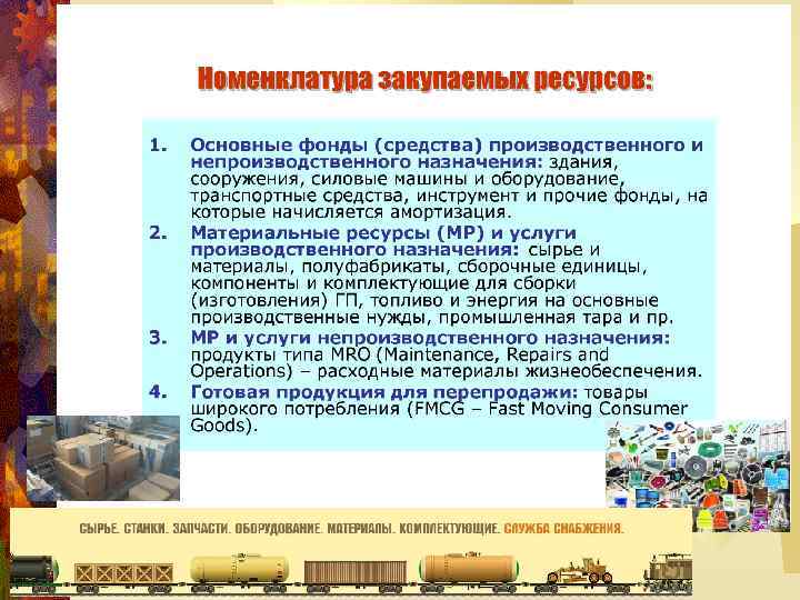 ВИДЫ ДЕЯТЕЛЬНОСТИ ® планирование поступлений МР и (или) ГП и контроль на этом этапе; ® собственно закупки; ® доставка; ® приёмка и контроль качества; ® хранение и отпуск на производство; ® распоряжение невостребованными и некачественными остатками.