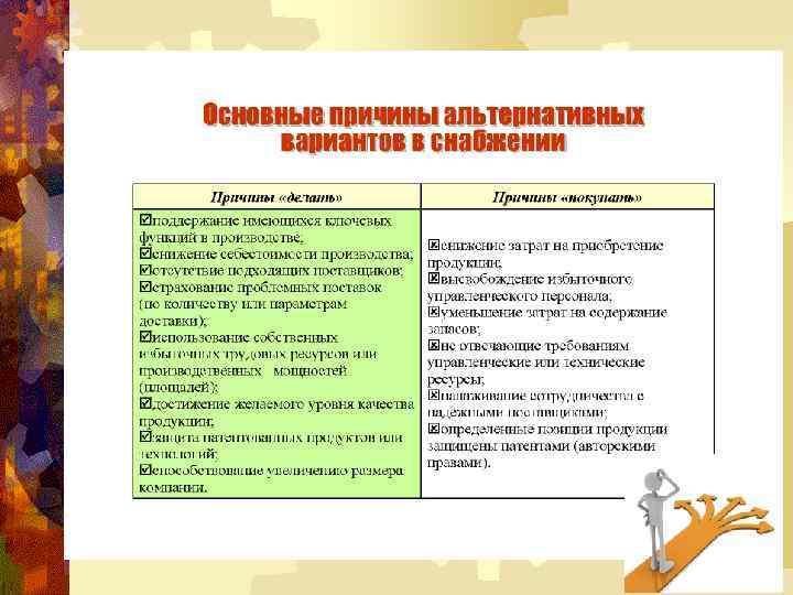 Связь снабжения со стратегией компании 2) Отдел закупок может помочь организации добиться успеха, выявляя новых поставщиков и развивая отношения с уже имеющимися. Общее время разработки или модификации можно сократить за счёт привлечения поставщиков на раннем этапе разработок новых товаров или услуг, а также модификации существующих вариантов. Идея «сжатого времени» , т. е. более быстрого выхода на рынок с новыми предложениями, может быть очень важной для успеха, так как помогает организации занять на рынке позицию лидера или новатора.
