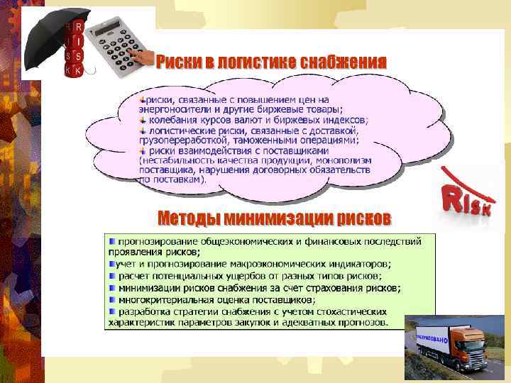 Анализ портфеля закупок с помощью матрицы Kraljic Риск поставки (supply risk) для каждой позиции можно оценить на основе учёта таких факторов как: • количество поставщиков; • надёжность поставщиков; • конкурентный спрос; • риск хранения; • возможность замены.