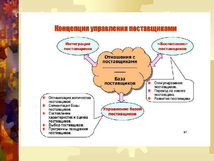 УПРАВЛЕНИЕ ВЗАИМООТНОШЕНИЯМИ С ПОСТАВЩИКАМИ Компоненты – это виды деятельности и процессы, задаваемые менеджерами и контролируемые ими на протяжении всего срока существования партнёрства. Каждое партнёрство имеет одни и те же базовые компоненты, но способы, при помощи которых партнёрства реализуются и управляются, меняются.