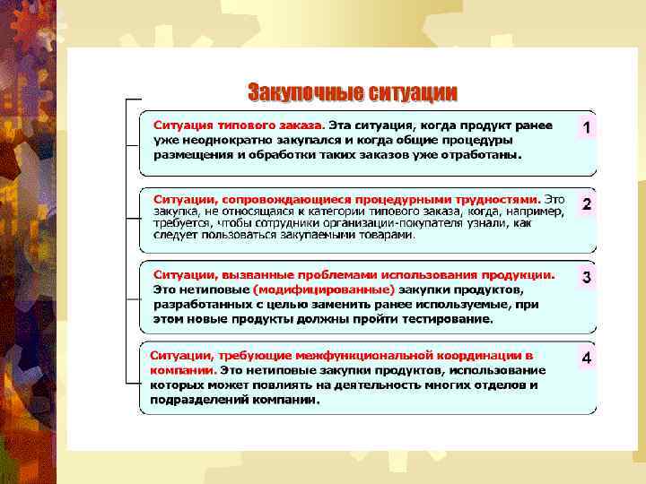 Анализ портфеля закупок с помощью матрицы Kraljic Квадрант Цели Основные задачи 3. Noncritical products (малое влияние на прибыль – низкий риск) Сокращение административных процедур и затрат. Повышение операционной эффективности. Упростить процедуры оформления заказов, покупки и оплаты. Стандартизация там, где возможно. Консолидация закупок. Е-закупки. Поощрение прямых заказов внутренних потребителей вместо отложенных контрактов. Возможность перемещения в квадрант 1. Необходимая информация Обзор рынка. Краткосрочный прогноз потребности.