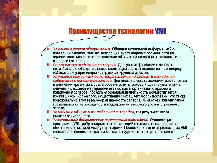 УПРАВЛЕНИЕ ВЗАИМООТНОШЕНИЯМИ С ПОСТАВЩИКАМИ Основные потенциальные выгоды, усиливающие стремление к партнёрству: ® эффективное использование активов/ затрат; ® улучшение обслуживания потребителей; ® маркетинговые преимущества; ® стабильность/ рост прибыли.