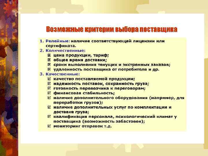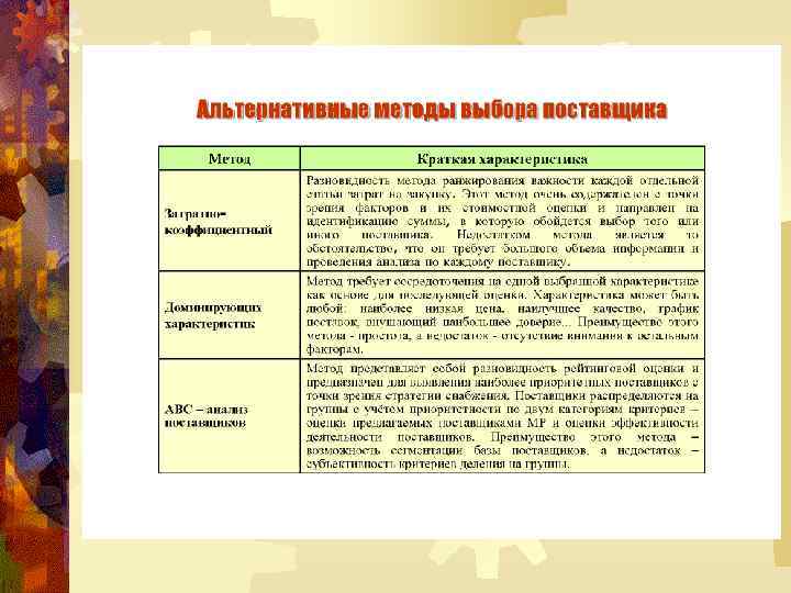 АЛГОРИТМ ВЫБОРА ПОСТАВЩИКА Определение номенклатуры и спецификаций материальных ресурсов Планирование спроса Определение параметров заказа и поставок Анализ рынка и поиск всех возможных поставщиков Предварительная оценка и отбор поставщиков Исключение поставщика Поставщик удовлетворяет основным критериям? Оценка оставшихся поставщиков Основные критерии отбора качество надежность цена Поставщик удовлетворяет системе критериев? Ранжирование поставщиков и выбор главного из них Заключение договора на поставку Дополнительные критерии