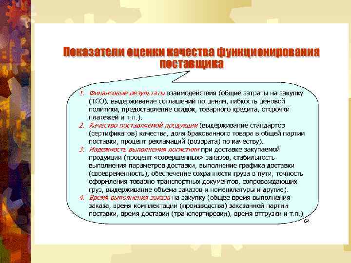 УПРАВЛЕНИЕ ВЗАИМООТНОШЕНИЯМИ С ПОСТАВЩИКАМИ Результаты выражаются показателями деятельности партнёрства. Всегда следует оценивать эффективность взаимоотношений сторон и при необходимости предпринимать корректирующие действия (обратная связь). Ключом к эффективному измерению и установлению обратной связи является то, насколько хорошо все стимулы партнёрства учтены в начале его реализации.