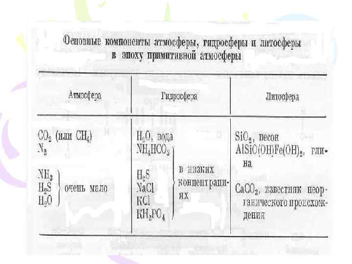 5. Биохимические концепции зарождения жизни (абиогенез). В 1924 А. И. Опарин высказал мнение, что в условиях первичной атмосферы Земли, значительно отличающейся от нынешней, мог происходить синтез всех необходимых для зарождения жизни веществпредшественников.