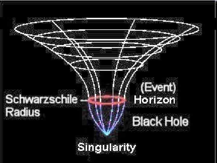 § Горизонт событий – сфера радиуса Шварцшильда r = rg. Ничто, даже свет, не может выйти вовне из этой сферы. § Черная дыра – тело, радиус которого меньше радиуса Шварцшильда, т. е. поверхность находится за горизонтом событий. § Сингулярность – точка в пр-ве-времени, через которую невозможно гладко продолжить входящую в неё геодезическую линию. Такими свойствами обладает центр черной дыры. Перестают выполняться физические законы.