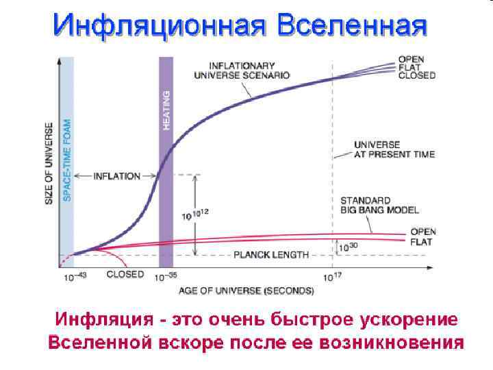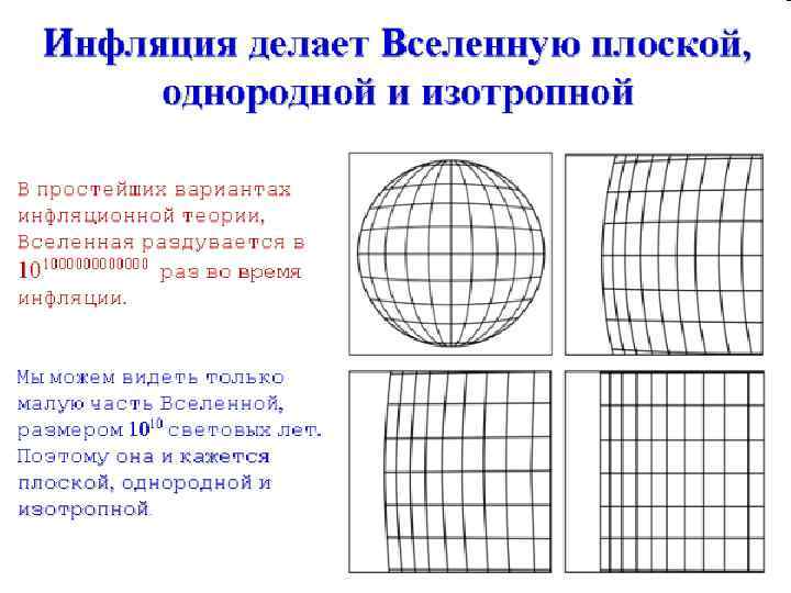 § Модель инфляции: при разделении сильных и слабых взаимодействий во Вселенной произошло скачкообразное расширение. § Это расширение было во много раз быстрее обычного хаббловского. Примерно за 10– 35 секунды Вселенная расширилась в 10100… (? ) раз — была меньше протона, а стала больше ныне наблюдаемой нами части.
