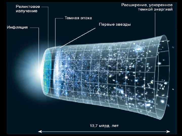 1917 Релятивистская космология Эйнштейна 1922 Модели Фридмана 1929 40 -е Закон Хаббла 1965 Реликтовое излучение 80 -е Экспериментальное подвтерждение Горячая Вселенная Гамова Инфляционная модель Открытие темной материи и 70 -90 -е темной энергии 1998 Расширение – с ускорением!