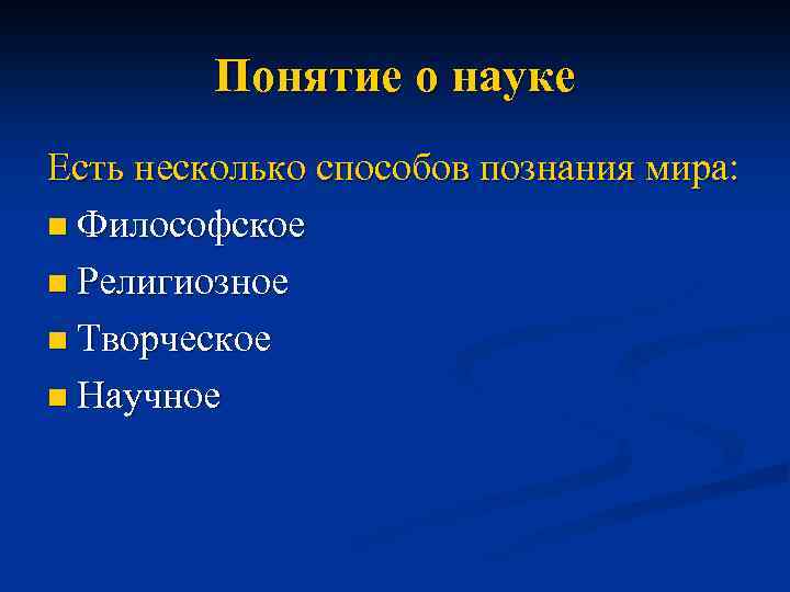 Понятие о науке Есть несколько способов познания мира: n Философское n Религиозное n Творческое n Научное