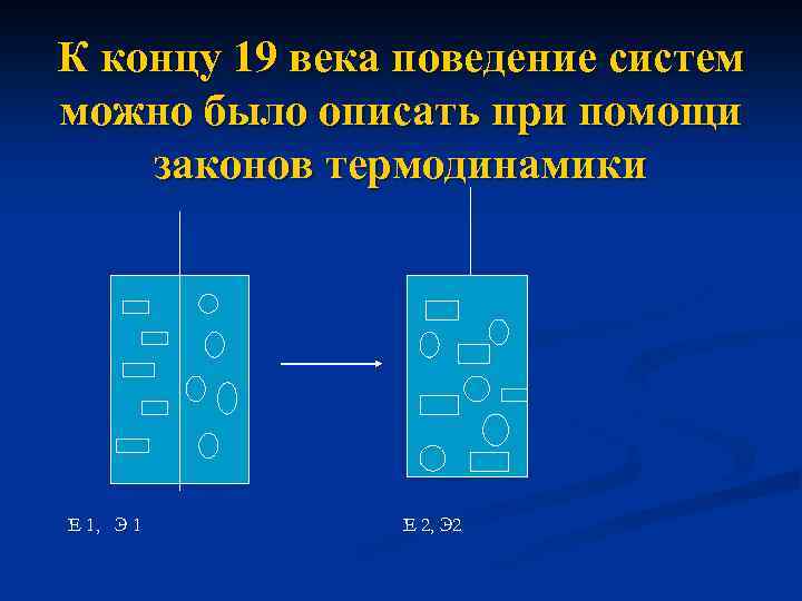 К концу 19 века поведение систем можно было описать при помощи законов термодинамики E 1, Э 1 E 2, Э 2