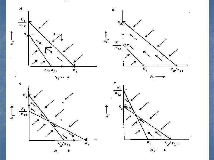 Результат конкуренции – вариант Г n n n При K 1/ α 12 > K 2 и K 2/ α 21 > K 2 ∙ α 12 и K 2 > K 1 ∙ α 21 Для обоих видов сильнее выражена внутривидовая конкуренция, чем межвидовая. Устойчивое равновесие достигается при некотором сочетании видов. Популяции стремятся к сосуществованию