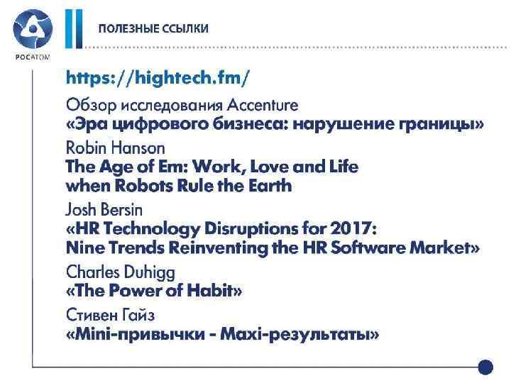 ТЕХНОЛОГИЧЕСКАЯ КАРТА HR-TECH РАСШИРЕНИЕ ВОЗМОЖНОСТЕЙ РАБОТНИКА 1 Внедрение предсказательной HR-аналитики 2016 – пилот 2017 – архитектура ДОПОЛНЕНИЕ ВОЗМОЖНОСТЕЙ РАБОТНИКА 2 Замена курсов по иностранным языкам 2016 – старт AR/VR/MR 2016 - план Поддержка психофизиологическог о обеспечения 2017 – «разведка» Анализ невербалики (вебинары) 2017 - реализация ЗАМЕЩЕНИЕ РАБОТНИКА 3 Автоматизация HRконсультирования Роботизация транзакционных HR-процессов 2017 – пилот