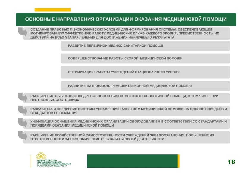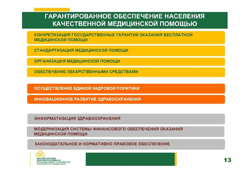 КОНКРЕТИЗАЦИЯ ГОСУДАРСТВЕННЫХ ГАРАНТИЙ ОКАЗАНИЯ БЕСПЛАТНОЙ МЕДИЦИНСКОЙ ПОМОЩИ СТАНДАРТИЗАЦИЯ МЕДИЦИНСКОЙ ПОМОЩИ ОРГАНИЗАЦИЯ МЕДИЦИНСКОЙ ПОМОЩИ ОБЕСПЕЧЕНИЕ ЛЕКАРСТВЕННЫМИ СРЕДСТВАМИ ОСУЩЕСТВЛЕНИЕ ЕДИНОЙ КАДРОВОЙ ПОЛИТИКИ ИННОВАЦИОННОЕ РАЗВИТИЕ ЗДРАВООХРАНЕНИЯ ИНФОРМАТИЗАЦИЯ ЗДРАВООХРАНЕНИЯ МОДЕРНИЗАЦИЯ СИСТЕМЫ ФИНАНСОВОГО ОБЕСПЕЧЕНИЯ ОКАЗАНИЯ МЕДИЦИНСКОЙ ПОМОЩИ ЗАКОНОДАТЕЛЬНОЕ И НОРМАТИВНО ПРАВОВОЕ ОБЕСПЕЧЕНИЕ 13