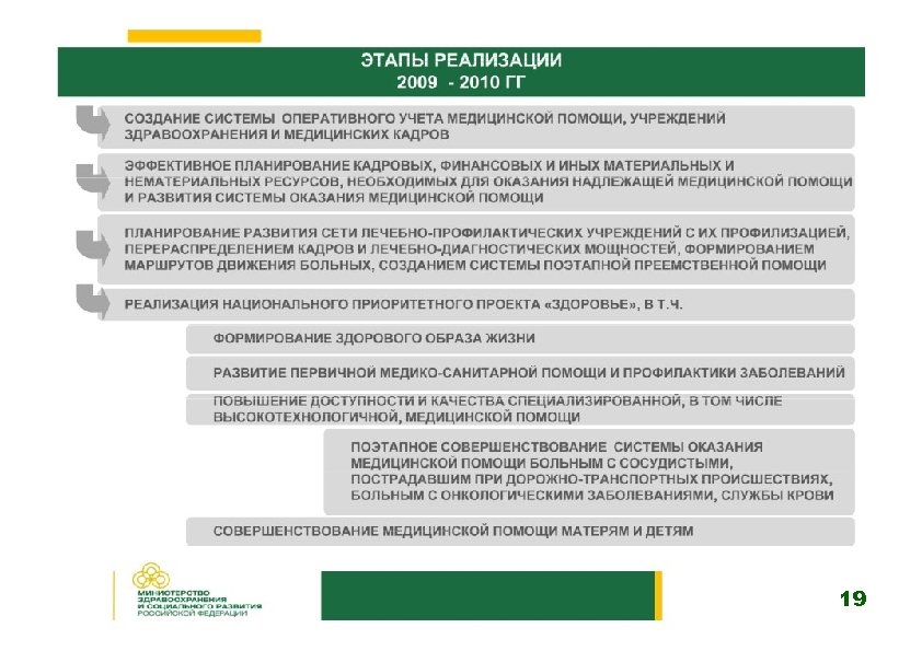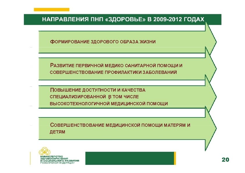 ОРМИРОВАНИЕ ЗДОРОВОГО ОБРАЗА ЖИЗНИ АЗВИТИЕ ПЕРВИЧНОЙ МЕДИКО САНИТАРНОЙ ПОМОЩИ И СОВЕРШЕНСТВОВАНИЕ ПРОФИЛАКТИКИ ЗАБОЛЕВАНИЙ ОВЫШЕНИЕ ДОСТУПНОСТИ И КАЧЕСТВА СПЕЦИАЛИЗИРОВАННОЙ В ТОМ ЧИСЛЕ ВЫСОКОТЕХНОЛОГИЧНОЙ МЕДИЦИНСКОЙ ПОМОЩИ ОВЕРШЕНСТВОВАНИЕ МЕДИЦИНСКОЙ ПОМОЩИ МАТЕРЯМ И ДЕТЯМ 20