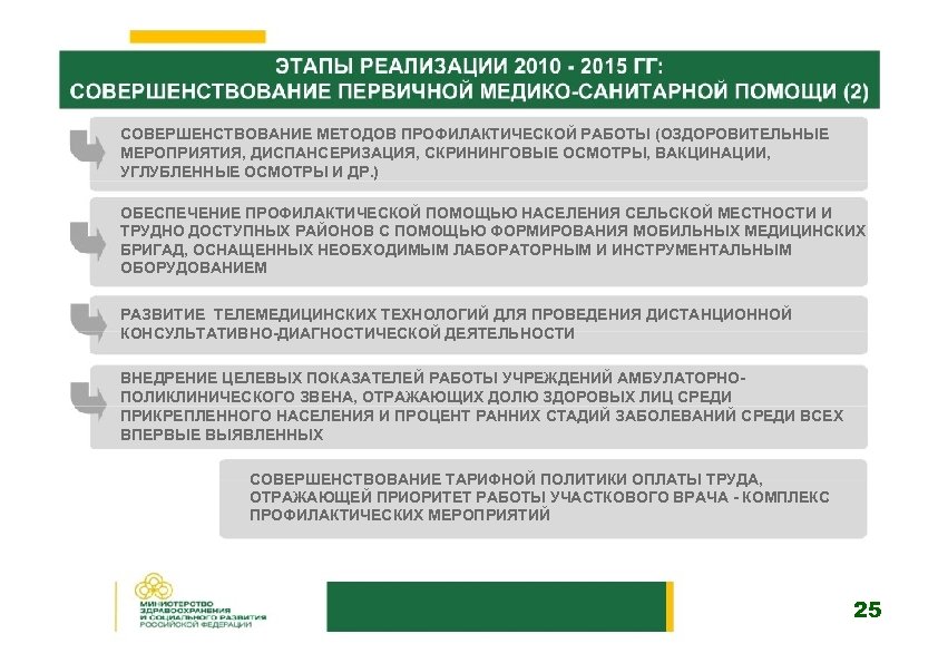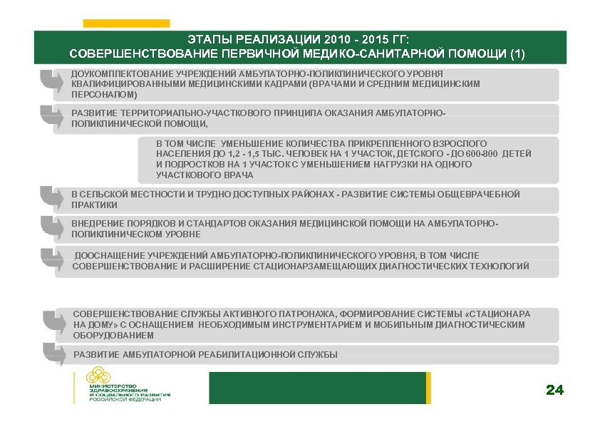 ЭТАПЫ РЕАЛИЗАЦИИ 2010 - 2015 ГГ: СОВЕРШЕНСТВОВАНИЕ ПЕРВИЧНОЙ МЕДИКО-САНИТАРНОЙ ПОМОЩИ (1) ДОУКОМПЛЕКТОВАНИЕ УЧРЕЖДЕНИЙ АМБУЛАТОРНО-ПОЛИКЛИНИЧЕСКОГО УРОВНЯ КВАЛИФИЦИРОВАННЫМИ МЕДИЦИНСКИМИ КАДРАМИ (ВРАЧАМИ И СРЕДНИМ МЕДИЦИНСКИМ ПЕРСОНАЛОМ) РАЗВИТИЕ ТЕРРИТОРИАЛЬНО-УЧАСТКОВОГО ПРИНЦИПА ОКАЗАНИЯ АМБУЛАТОРНОПОЛИКЛИНИЧЕСКОЙ ПОМОЩИ, В ТОМ ЧИСЛЕ УМЕНЬШЕНИЕ КОЛИЧЕСТВА ПРИКРЕПЛЕННОГО ВЗРОСЛОГО НАСЕЛЕНИЯ ДО 1, 2 - 1, 5 ТЫС. ЧЕЛОВЕК НА 1 УЧАСТОК, ДЕТСКОГО - ДО 600 -800 ДЕТЕЙ И ПОДРОСТКОВ НА 1 УЧАСТОК С УМЕНЬШЕНИЕМ НАГРУЗКИ НА ОДНОГО УЧАСТКОВОГО ВРАЧА В СЕЛЬСКОЙ МЕСТНОСТИ И ТРУДНО ДОСТУПНЫХ РАЙОНАХ - РАЗВИТИЕ СИСТЕМЫ ОБЩЕВРАЧЕБНОЙ ПРАКТИКИ ВНЕДРЕНИЕ ПОРЯДКОВ И СТАНДАРТОВ ОКАЗАНИЯ МЕДИЦИНСКОЙ ПОМОЩИ НА АМБУЛАТОРНОПОЛИКЛИНИЧЕСКОМ УРОВНЕ ДООСНАЩЕНИЕ УЧРЕЖДЕНИЙ АМБУЛАТОРНО-ПОЛИКЛИНИЧЕСКОГО УРОВНЯ, В ТОМ ЧИСЛЕ СОВЕРШЕНСТВОВАНИЕ И РАСШИРЕНИЕ СТАЦИОНАРЗАМЕЩАЮЩИХ ДИАГНОСТИЧЕСКИХ ТЕХНОЛОГИЙ СОВЕРШЕНСТВОВАНИЕ СЛУЖБЫ АКТИВНОГО ПАТРОНАЖА, ФОРМИРОВАНИЕ СИСТЕМЫ «СТАЦИОНАРА НА ДОМУ» С ОСНАЩЕНИЕМ НЕОБХОДИМЫМ ИНСТРУМЕНТАРИЕМ И МОБИЛЬНЫМ ДИАГНОСТИЧЕСКИМ ОБОРУДОВАНИЕМ РАЗВИТИЕ АМБУЛАТОРНОЙ РЕАБИЛИТАЦИОННОЙ СЛУЖБЫ 24