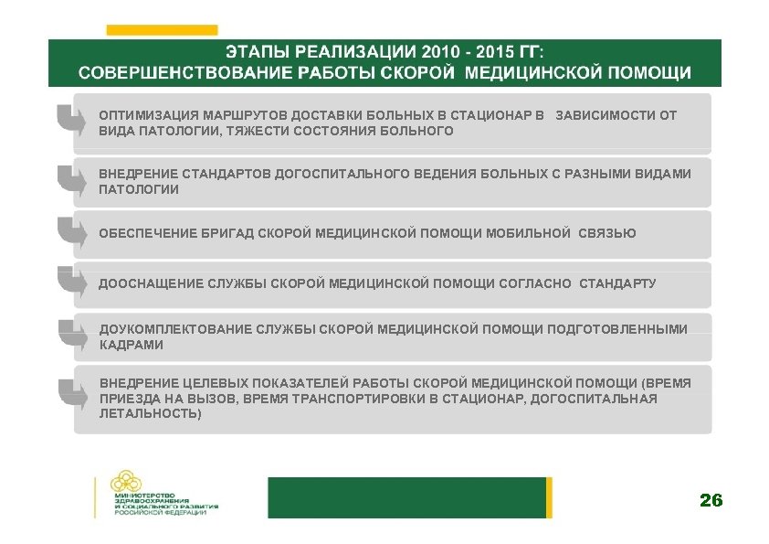 ОПТИМИЗАЦИЯ МАРШРУТОВ ДОСТАВКИ БОЛЬНЫХ В СТАЦИОНАР В ЗАВИСИМОСТИ ОТ ВИДА ПАТОЛОГИИ, ТЯЖЕСТИ СОСТОЯНИЯ БОЛЬНОГО ВНЕДРЕНИЕ СТАНДАРТОВ ДОГОСПИТАЛЬНОГО ВЕДЕНИЯ БОЛЬНЫХ С РАЗНЫМИ ВИДАМИ ПАТОЛОГИИ ОБЕСПЕЧЕНИЕ БРИГАД СКОРОЙ МЕДИЦИНСКОЙ ПОМОЩИ МОБИЛЬНОЙ СВЯЗЬЮ ДООСНАЩЕНИЕ СЛУЖБЫ СКОРОЙ МЕДИЦИНСКОЙ ПОМОЩИ СОГЛАСНО СТАНДАРТУ ДОУКОМПЛЕКТОВАНИЕ СЛУЖБЫ СКОРОЙ МЕДИЦИНСКОЙ ПОМОЩИ ПОДГОТОВЛЕННЫМИ КАДРАМИ ВНЕДРЕНИЕ ЦЕЛЕВЫХ ПОКАЗАТЕЛЕЙ РАБОТЫ СКОРОЙ МЕДИЦИНСКОЙ ПОМОЩИ (ВРЕМЯ ПРИЕЗДА НА ВЫЗОВ, ВРЕМЯ ТРАНСПОРТИРОВКИ В СТАЦИОНАР, ДОГОСПИТАЛЬНАЯ ЛЕТАЛЬНОСТЬ) 26