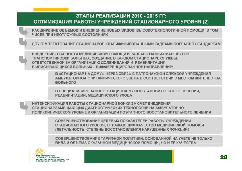 ЭТАПЫ РЕАЛИЗАЦИИ 2010 - 2015 ГГ: ОПТИМИЗАЦИЯ РАБОТЫ УЧРЕЖДЕНИЙ СТАЦИОНАРНОГО УРОВНЯ (1) РАЦИОНАЛЬНОЕ РАСПРЕДЕЛЕНИЕ ФУНКЦИОНАЛЬНЫХ ОБЯЗАННОСТЕЙ СТАЦИОНАРОВ: МУНИЦИПАЛЬНЫЕ (ГОРОДСКИЕ И РАЙОННЫЕ) - ДЛЯ ОКАЗАНИЯ ПЕРВИЧНОЙ ПОМОЩИ ПРИ НЕОТЛОЖНЫХ СОСТОЯНИЯХ МЕЖРАЙОННЫЕ - ДЛЯ ОКАЗАНИЯ СПЕЦИАЛИЗИРОВАННОЙ ПОМОЩИ, В ТОМ ЧИСЛЕ ПРИ НЕОТЛОЖНЫХ СОСТОЯНИЯХ И СОСТОЯНИЯХ, ТРЕБУЮЩИХ ВОССТАНОВИТЕЛЬНОГО ЛЕЧЕНИЯ И РЕАБИЛИТАЦИИ СУБЪЕКТОВЫЕ И ФЕДЕРАЛЬНЫЕ - ДЛЯ ОКАЗАНИЯ СПЕЦИАЛИЗИРОВАННОЙ, В ТОМ ЧИСЛЕ ВЫСОКОТЕХНОЛОГИЧНОЙ, ПОМОЩИ ПОЭТАПНОЕ СОЗДАНИЕ ГОЛОВНЫХ РЕГИОНАЛЬНЫХ ЦЕНТРОВ, КООРДИНИРУЮЩИХ ВЕСЬ ОБЪЕМ ПРОФИЛАКТИЧЕСКИХ, ДИАГНОСТИЧЕСКИХ И ЛЕЧЕБНЫХ МЕРОПРИЯТИЙ ПО СОЦИАЛЬНО-ЗНАЧИМЫМ МЕДИЦИНСКИМ ПРОБЛЕМАМ ОБЕСПЕЧЕНИЕ РАБОТЫ КРУГЛОСУТОЧНОЙ ТЕЛЕМЕДИЦИНСКОЙ СВЯЗИ МЕЖДУ СТАЦИОНАРАМИ МУНИЦИПАЛЬНОГО И СУБЪЕКТОВОГО ПОДЧИНЕНИЯ ВНЕДРЕНИЕ В ДЕЯТЕЛЬНОСТЬ КЛИНИЧЕСКИХ ПОДРАЗДЕЛЕНИЙ СТАЦИОНАРОВ ПРОТОКОЛОВ ВЕДЕНИЯ БОЛЬНЫХ И СТАНДАРТОВ МЕДИЦИНСКОЙ ПОМОЩИ, РЕГИСТРОВ СТАЦИОНАРНЫХ БОЛЬНЫХ И СИСТЕМЫ УПРАВЛЕНИЯ КАЧЕСТВОМ МЕДИЦИНСКОЙ ПОМОЩИ ДООСНАЩЕНИЕ СТАЦИОНАРОВ СОГЛАСНО СТАНДАРТАМ 27