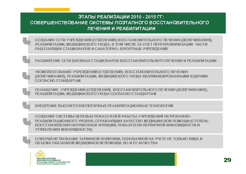 ЭТАПЫ РЕАЛИЗАЦИИ 2010 - 2015 ГГ: СОВЕРШЕНСТВОВАНИЕ СИСТЕМЫ ПОЭТАПНОГО ВОССТАНОВИТЕЛЬНОГО ЛЕЧЕНИЯ И РЕАБИЛИТАЦИИ СОЗДАНИЕ СЕТИ УЧРЕЖДЕНИЙ (ОТДЕЛЕНИЙ) ВОССТАНОВИТЕЛЬНОГО ЛЕЧЕНИЯ (ДОЛЕЧИВАНИЯ), РЕАБИЛИТАЦИИ, МЕДИЦИНСКОГО УХОДА, В ТОМ ЧИСЛЕ ЗА СЧЕТ ПЕРЕПРОФИЛИЗАЦИИ ЧАСТИ РАБОТАЮЩИХ СТАЦИОНАРОВ И САНАТОРНО- КУРОРТНЫХ УЧРЕЖДЕНИЙ РАСШИРЕНИЕ СЕТИ ДНЕВНЫХ СТАЦИОНАРОВ ВОССТАНОВИТЕЛЬНОГО ЛЕЧЕНИЯ И РЕАБИЛИТАЦИИ УКОМПЛЕКТОВАНИЕ УЧРЕЖДЕНИЙ (ОТДЕЛЕНИЙ) ВОССТАНОВИТЕЛЬНОГО ЛЕЧЕНИЯ (ДОЛЕЧИВАНИЯ), РЕАБИЛИТАЦИИ, МЕДИЦИНСКОГО УХОДА КВАЛИФИЦИРОВАННЫМИ КАДРАМИ СОГЛАСНО СТАНДАРТАМ ОСНАЩЕНИЕ УЧРЕЖДЕНИЙ (ОТДЕЛЕНИЙ) ВОССТАНОВИТЕЛЬНОГО ЛЕЧЕНИЯ (ДОЛЕЧИВАНИЯ), РЕАБИЛИТАЦИИ, МЕДИЦИНСКОГО УХОДА СОГЛАСНО СТАНДАРТАМ ВНЕДРЕНИЕ ВЫСОКОТЕХНОЛОГИЧНЫХ РЕАБИЛИТАЦИОННЫХ ТЕХНОЛОГИЙ СОЗДАНИЕ СИСТЕМЫ ЦЕЛЕВЫХ ПОКАЗАТЕЛЕЙ РАБОТЫ УЧРЕЖДЕНИЙ ПАТРОНАЖНОРЕАБИЛИТАЦИОННОГО УРОВНЯ, ОТРАЖАЮЩИХ КАЧЕСТВО МЕДИЦИНСКОЙ ПОМОЩИ (СТЕПЕНЬ ВОССТАНОВЛЕНИЯ НАРУШЕННЫХ ФУНКЦИЙ, ПОКАЗАТЕЛИ ПЕРВИЧНОЙ ИНВАЛИДНОСТИ И УТЯЖЕЛЕНИЯ ИНВАЛИДНОСТИ) СОВЕРШЕНСТВОВАНИЕ ТАРИФНОЙ ПОЛИТИКИ, ОСНОВАННОЙ НА УЧЕТЕ НЕ ТОЛЬКО ВИДА И ОБЪЕМА ОКАЗАННОЙ МЕДИЦИНСКОЙ ПОМОЩИ, НО И ЕЕ КАЧЕСТВА 29